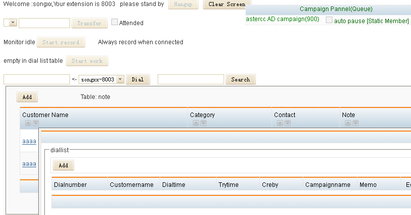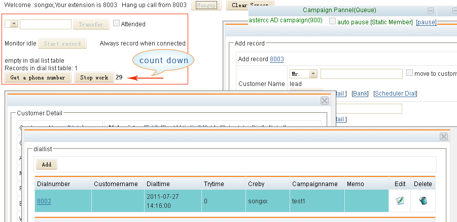 Click the “Start work”, the system will be calling dialnumber in the dial list one by one, at the moment the window about information will pop up, such as “input customer information”, “add records” pop-up window.