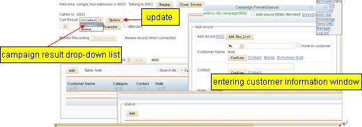 Arrow points to add a phone number to dial list, fill in the information completely, continue. You can also choose to bulk import, in order to import the phone number into dial list. When the call is connecting, the screen will pop up a window for agent to record the customer information. According to call ends the agent may choose the call result setting up before corresponding to the state. Then click Update. System prompted to update successfully.