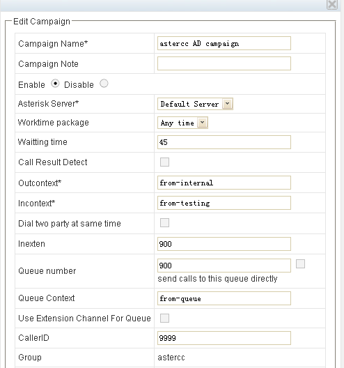 remember this feature code 800, we will use it when configing campaign in astercc, you could use some other code as you like, just make sure it’s unique in your freepbx