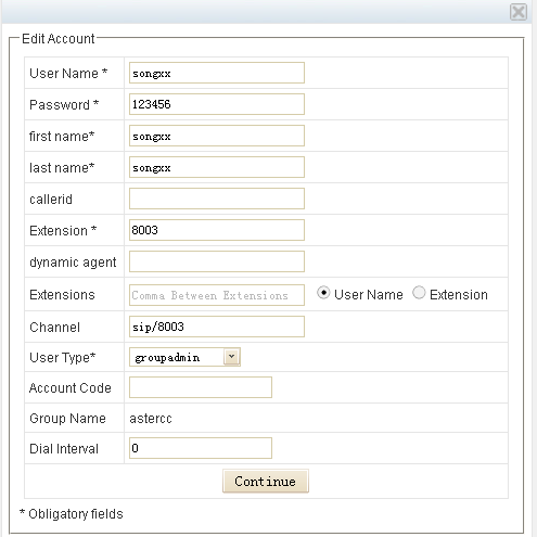 Agent can set time in count down optionally, go into extension in management interface, find the editor belongs to user name,click and pop up a window says “Edit Account”