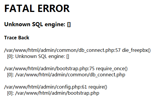 1.Some dependencies error (1).configure: error: no acceptable C compiler found in $PATH Solution:apt-get install gcc (2).configure: error: C++ preprocessor “/lib/cpp” fails sanity check Solution:apt-get install g++ or apt-get install build-essential (3). configure: *** XML documentation will not be available because the ‘libxml2’ development package is missing. configure: *** Please run the ‘configure’ script with the ‘–disable-xmldoc’ parameter option configure: *** or install the ‘libxml2’ development package. Solution:install libxml2-dev doesn’t help,run ./configure '--disable-xmldoc' (4). configure: error: *** termcap support not found (on modern systems, this typically means the ncurses development package is missing) Solution:apt-get install ncurses-dev (5). [FATAL] PEAR must be install (reauires DB.php). Include path: .:/usr/share/pear:/usr/local/src/PEAR Solution:pear install db 2.Unknown SQL engine Problem:After installing the FreePBX,admin page show the following message: FATAL ERROR Unknown SQL engine: [] Trace Back /var/www/html/admin/common/db_connect.php:57 die_freepbx() [0]: Unknown SQL engine: [] /var/www/html/admin/bootstrap.php:75 require_once() [0]: /var/www/html/admin/common/db_connect.php /var/www/html/admin/config.php:61 require()